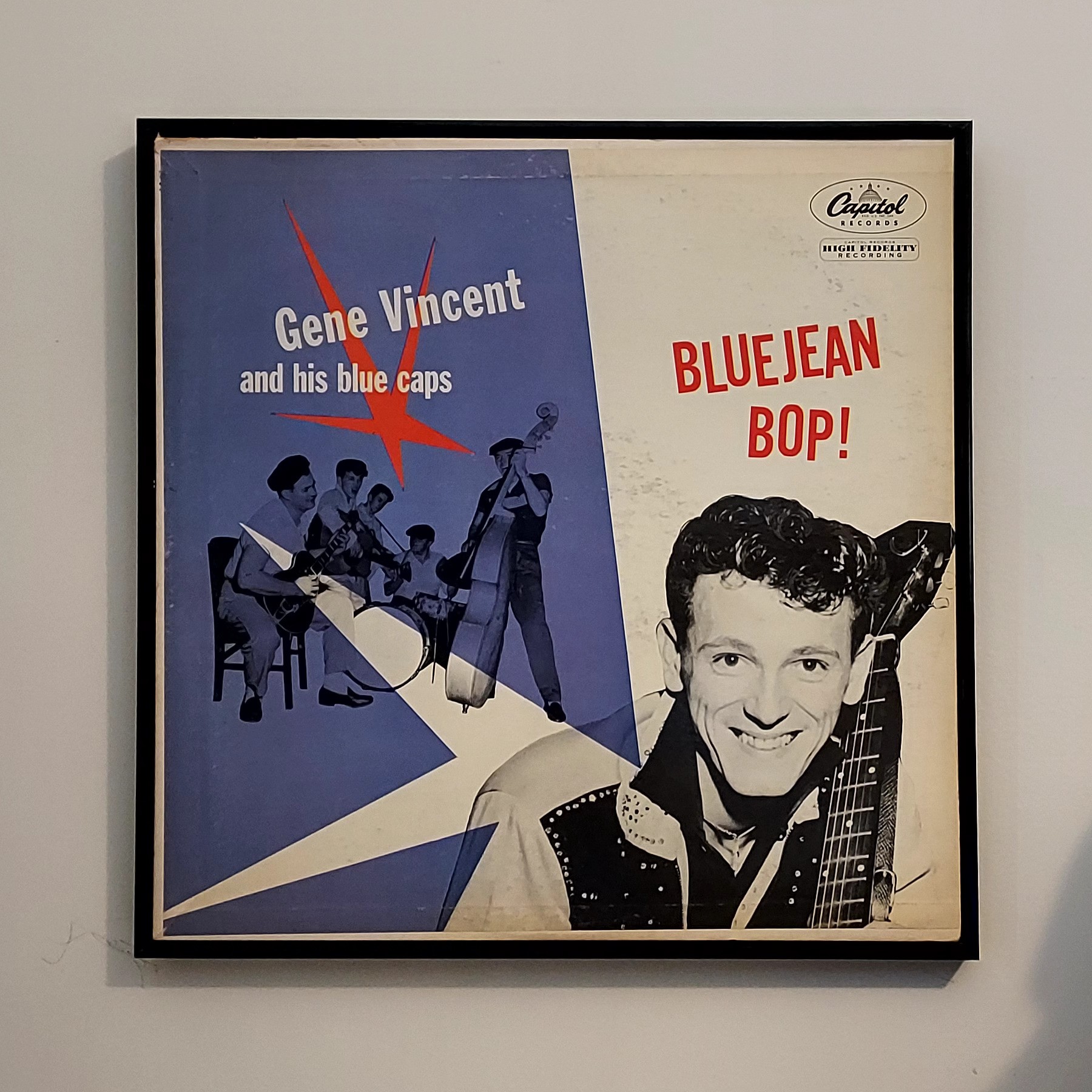I Got Lucky. Don't know how this original Gene Vincent album survived. I got it home, cleaned up the vinyl record, added a new paper sleeve insert, and framed it to hang on my hobby room wall as you can see in the photo above titled "Blue Jean Bop." Click on the photo for larger view.