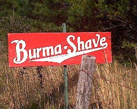 The familiar white on red signs, grouped by four, fives and sixes. You’d read first one, then another, anticipating the punch line on number five and the familiar Burma-Shave on the sixth.