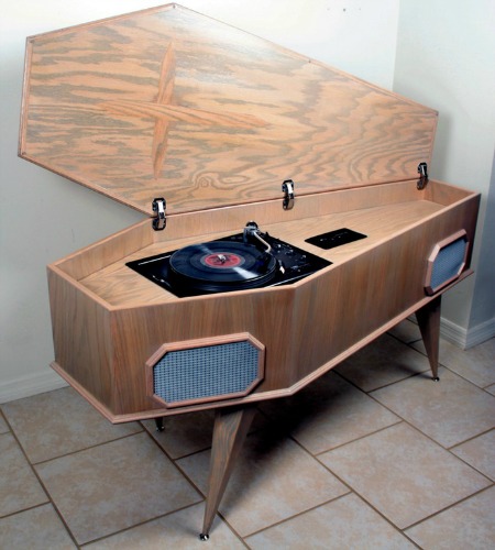 Some vinyl record junkies go all out to make a statement about their vinyl record collection. Don't know the thinking behind this coffin turntable setup but it is unique.